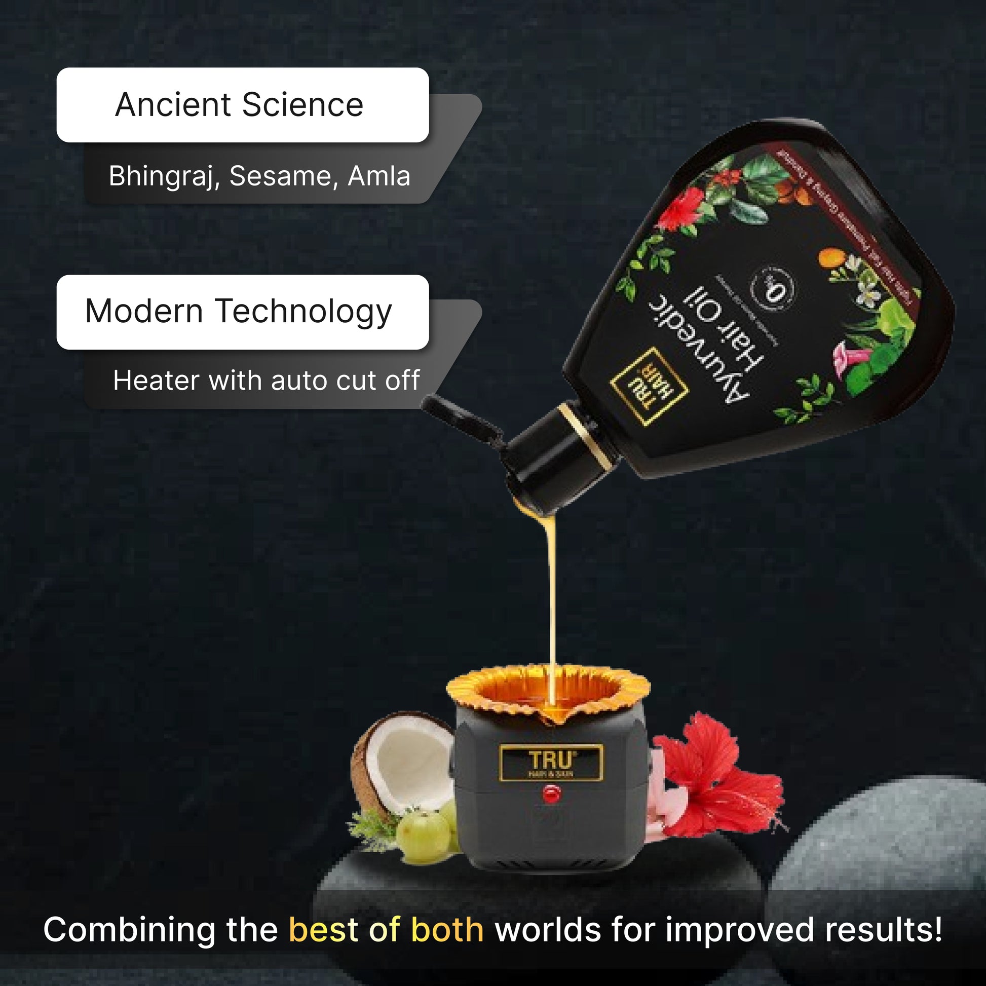 Tru Hair & Skin is the world’s 1st Ayurvedic Hair oil with a Tru Heater and is enriched with the goodness of 13 rare herbs. The Tru Hair & Skin oil heater, along with the special formulation, helps nourish the hair by penetrating the scalp to give you the best hot oil treatment for hair growth. This Tru Hair & Skin Oil with Heater fights hair fall, dandruff, and premature greying, ensuring healthy, lustrous hair.