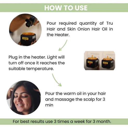 - BEST RESULTS WITH HEATER: The Heater, that comes with this best Onion Hair Oil, heats the oil to around 65° in about 4 mins. Massaging hot oil at 65° to your scalp and hair increases blood circulation in the scalp, strengthens your hair roots, and nourishes your hair with essential nutrients.